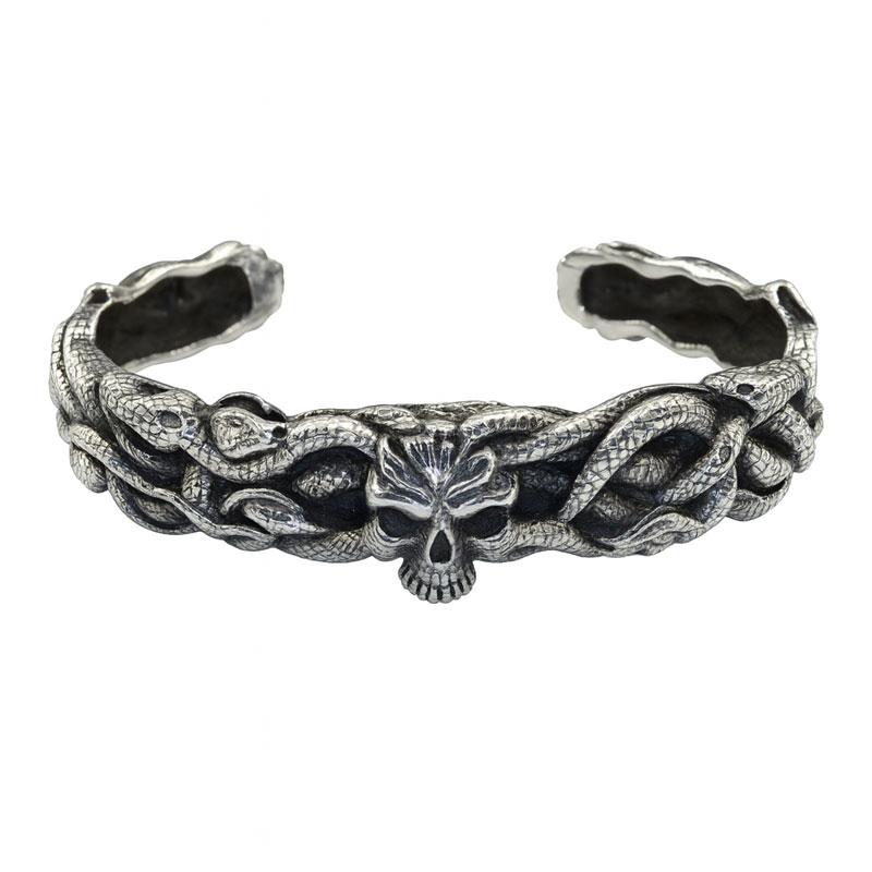 Silberarmreif „Yoki“ mit Totenkopf und Schlangen verziert