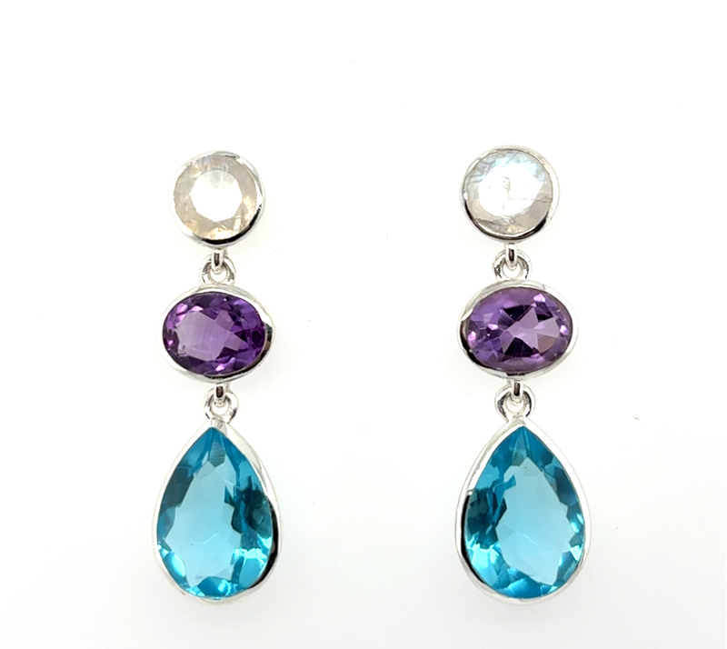 Silberohrringe „Tiffany“ mit Amethyst, Mondstein und blauer Topas