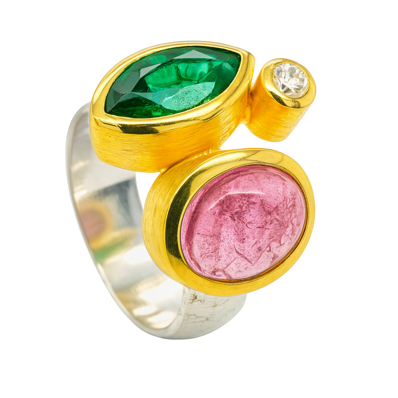 Silberring „Loreta“ mit pinkem Turmalin, Quarz und Moissanite Stein,Fassung vergoldet